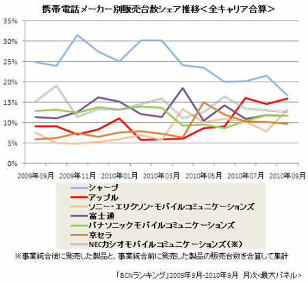 でも、9月はついにアップルがシャープに肉迫。もしかしたら10月にはアップルが1位になるかも?(ISO3は11月発売だし)