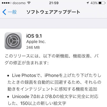 「iOS 9.1」「watchOS 2.0.1」「OS X El Capitan 10.11.1」「iTunes 12.3.1」がリリースです。